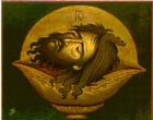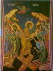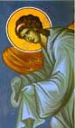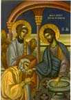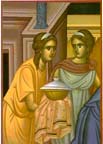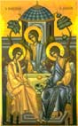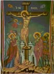 Τρίμορφον: Η Χώρα του αχωρήτου, με τον Ιησού(κέντρον), τον άγιο Ιωάννη τον Θεολόγο(αριστερά), και τον κτήτορα της Μονής του Ευαγγελισμού ιερομόναχο Αμφιλόχιο(δεξιά)